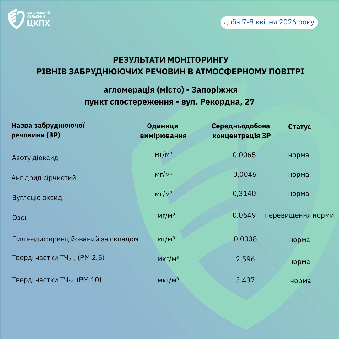 Результати моніторингу рівнів забруднюючих речовин в атмосферному повітря доба 7-8 квітня 2026 року