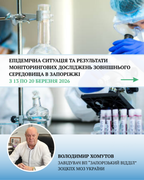 Епідемічна ситуація та результати моніторингових досліджень зовнішнього середовища в Запоріжжі з 13 по 20 березня 2026 р.