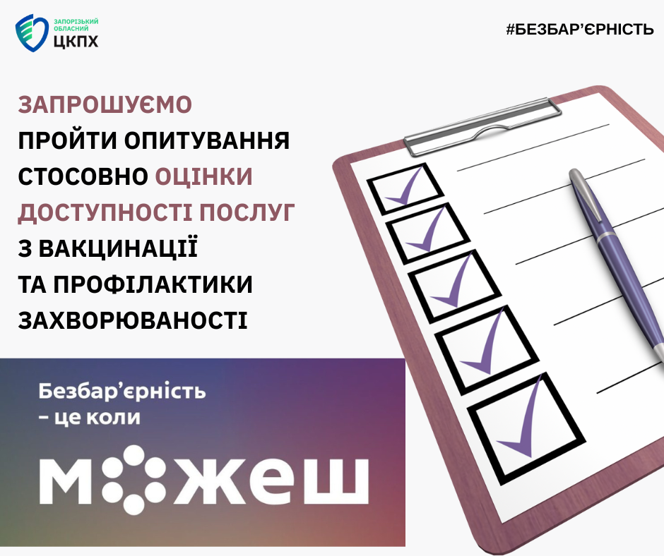 Для збільшення охоплення респондентів та ефективного визначення за результатами проведеної оцінки доступності послуг, основних бар’єрів, що заважають доступу до послуг з вакцинації та профілактики захворюваності для цільових груп Національної стратегії із створення безбар’єрного простору в Україні на період до 2030 року ЗАПРОШУЄМО ПРОЙТИ ОПИТУВАННЯ для збору та аналізу даних стосовно оцінки доступності послуг