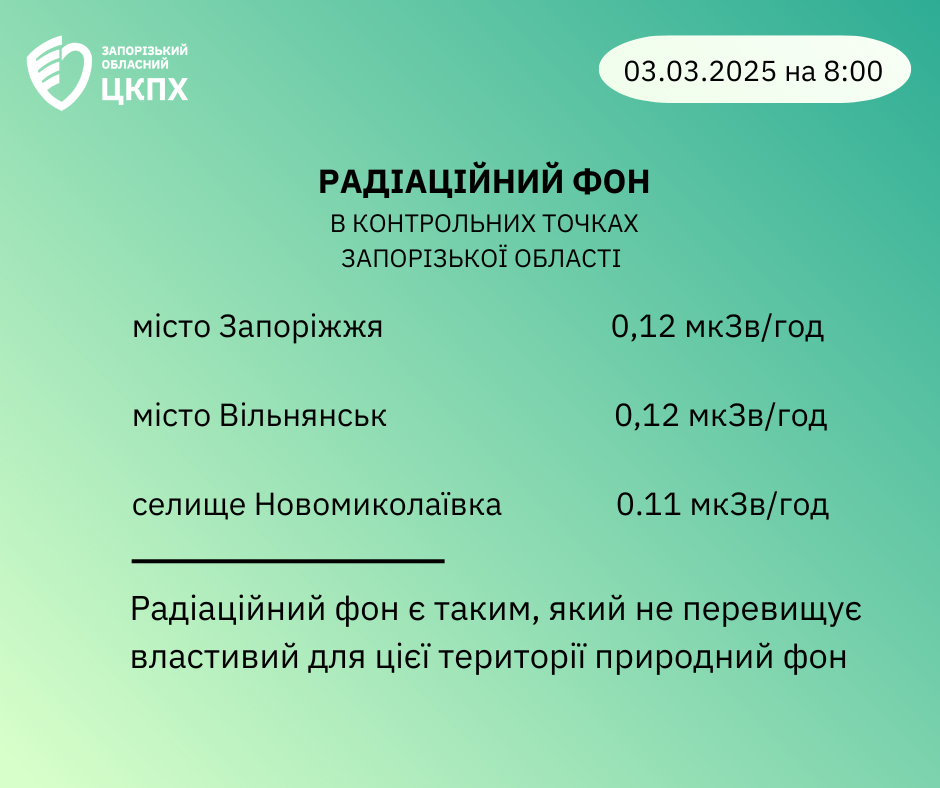 Радіаційний фон в контрольних точках Запорізької області 3 березня на 8:00 годин