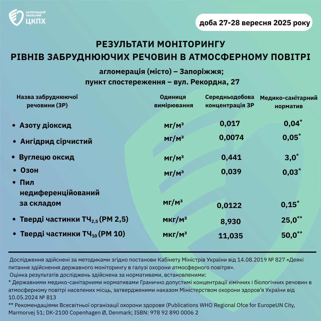 Результати моніторингу рівнів забруднюючих речовин в атмосферному повітрі 27-28 вересня 2025 року