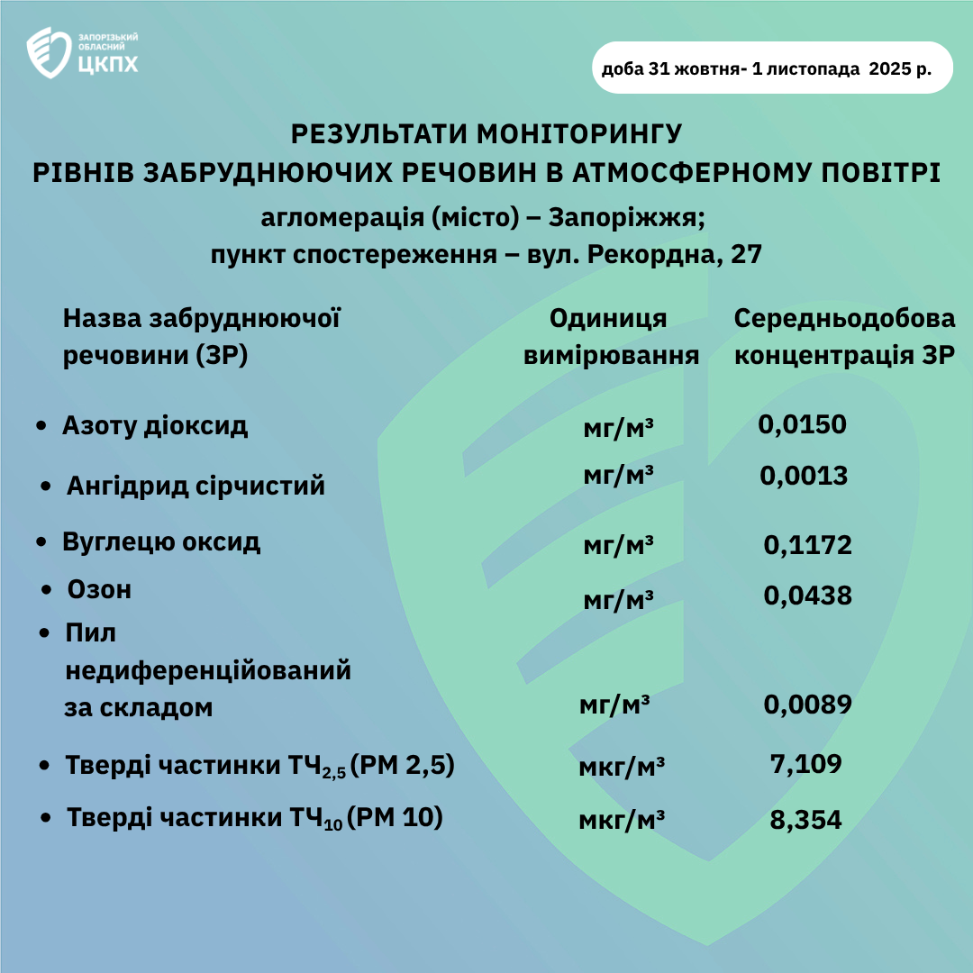 Результати моніторингу рівнів забруднюючих речовин в атмосферному повітрі Запоріжжя доба 31 жовтня-1 листопада 2025 року