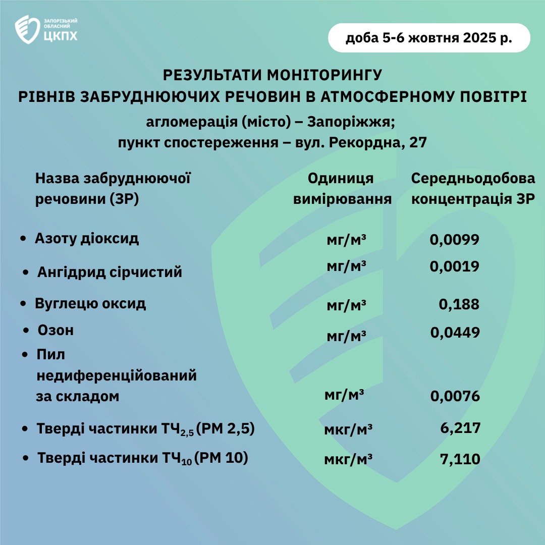 Результати моніторингу рівнів забруднюючих речовин в атмосферному повітрі Запоріжжя доба 5-6 жовтня 2025 р.