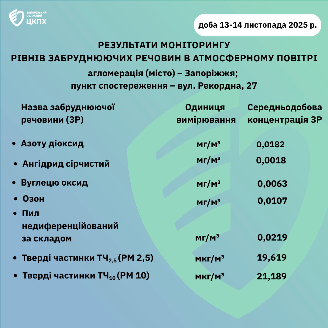 Результати моніторингу рівнів забруднюючих речовин в атмосферному повітрі Запоріжжя за добу 13-14 листопада 2025 р.