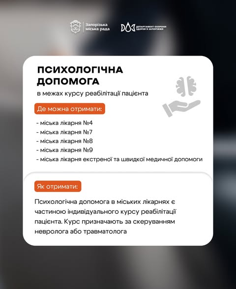 Під час курсу реабілітації в міських лікарнях психологічна підтримка може стати частиною індивідуального плану відновлення — за направленням від невролога чи травматолога. Така можливість доступна в кожній міській лікарні.