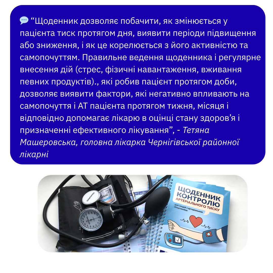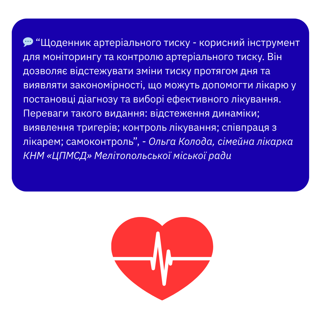 Щоденники контролю артеріального тиску були створені для людей з артеріальною гіпертензією за допомогою Європейського Союзу, Центр громадського здоров’я України. International Medical Corps, Центру знань, Українсько-швейцарський проєкт Діємо для здоров‘я у партнерстві з Центрами контролю та профілактики хвороб.