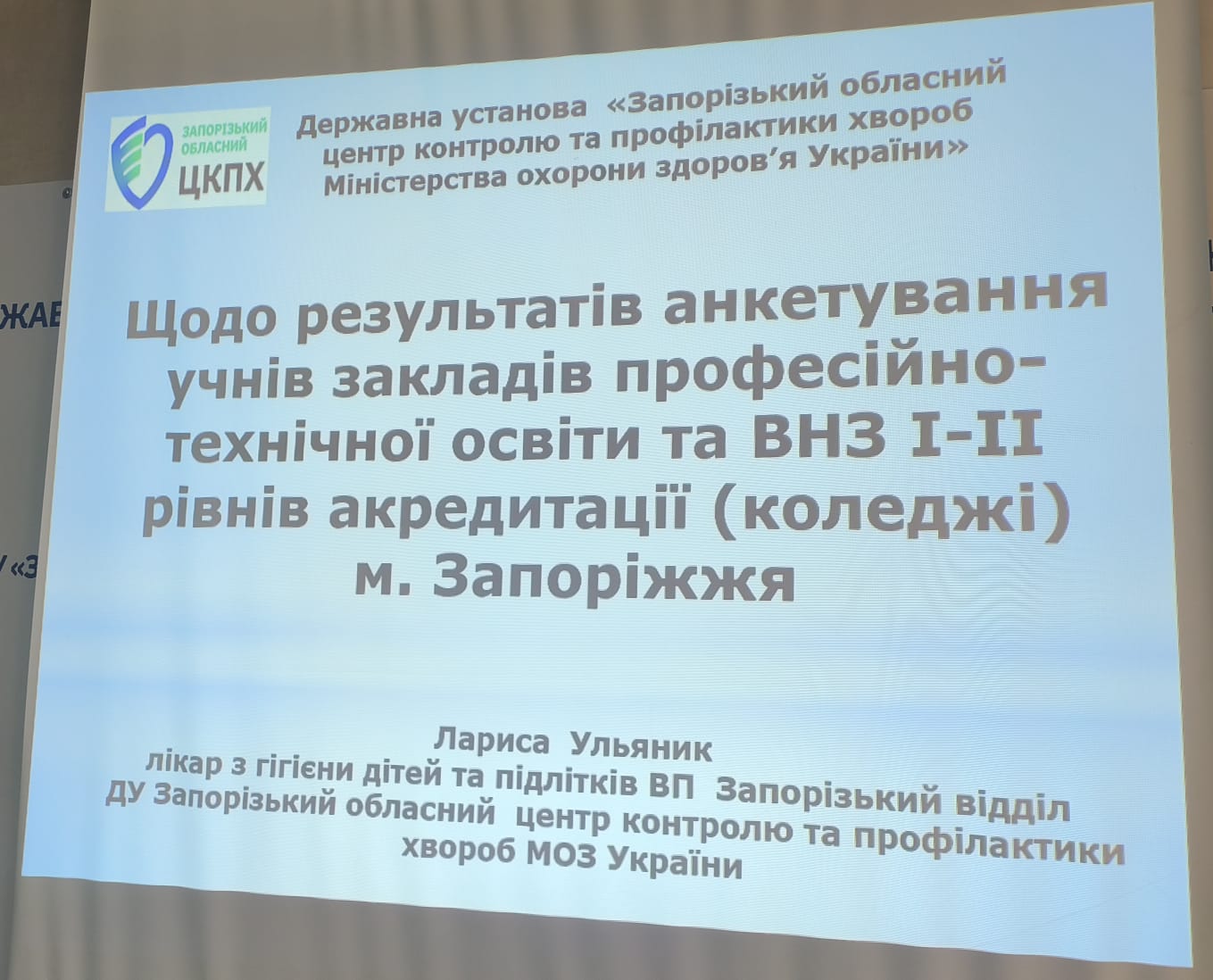 ▪ Лариса Ульяник, лікарка з гігієни дітей та підлітків, у своїй доповіді «Щодо результатів анкетування учнів закладів професійно-технічної освіти та ВНЗ І–ІІ рівнів акредитації (коледжів) м. Запоріжжя» поділилась даними соціологічного опитування щодо поширеності тютюнокуріння серед молоді та рівня обізнаності про його наслідки. Було наголошено на потребі у впровадженні нових підходів до формування свідомого ставлення до здоров’я у підлітковому середовищі.