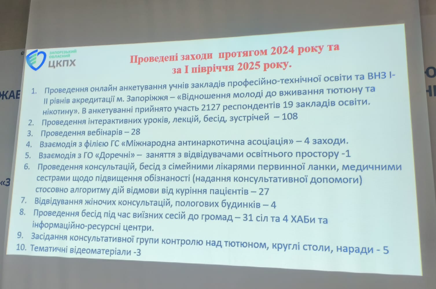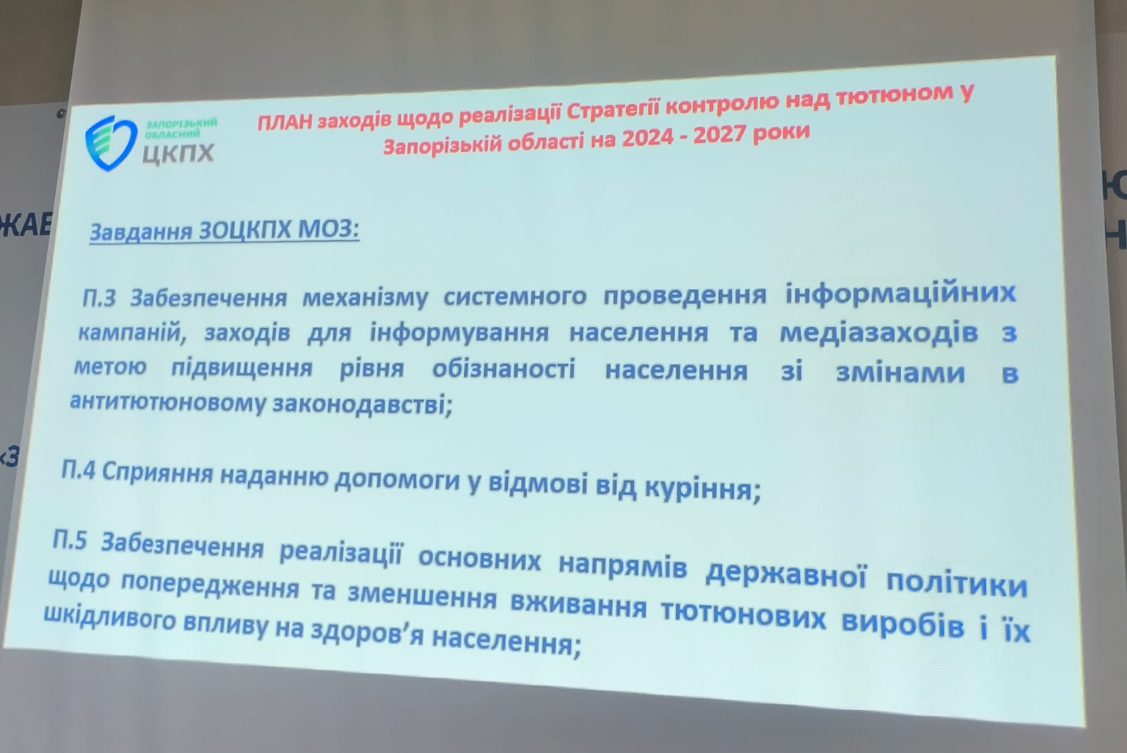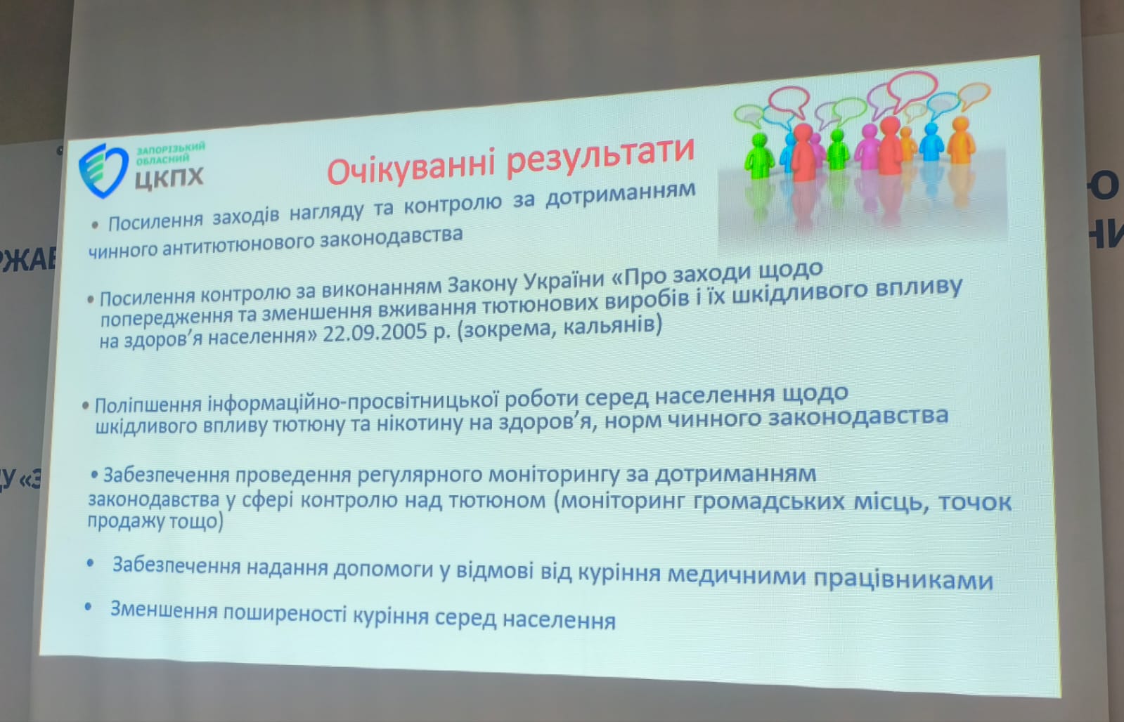 ▪ Катерина Острогляд, лікарка із загальної гігієни, презентувала аналітичний огляд «Оцінка ситуації щодо дотримання антитютюнового законодавства у Запорізькій області». Вона окреслила сучасний стан дотримання законодавства, основні виклики у реалізації заборон, а також підкреслила необхідність підвищення контролю з боку відповідальних структур.