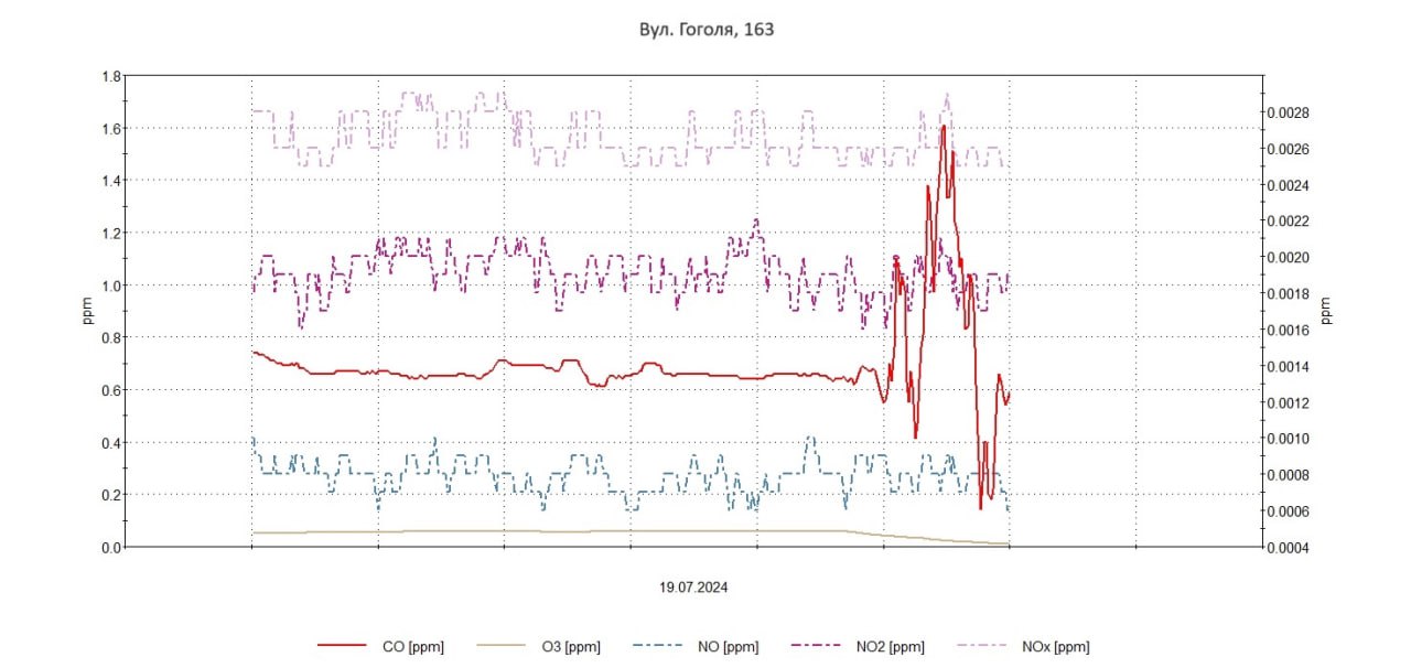 20 липня 2024Протягом дня були проведені планові моніторингові дослідження атмосферного повітря на території житлової забудови по північному напрямку факелу викидів в точках по вул. Гоголя, 163, вул. Сєдова- В. Грищенка з визначенням максимально-разових концентрацій оксиду вуглецю, діоксиду азоту, оксиду азоту, озону, формальдегіду, аміаку, сірководню, фенолу, хлору, ангідриду сірчистого, пилу недиференційованого за складом, хрому, кислоти сірчаної.