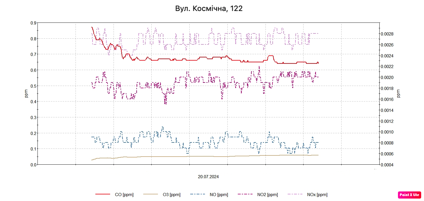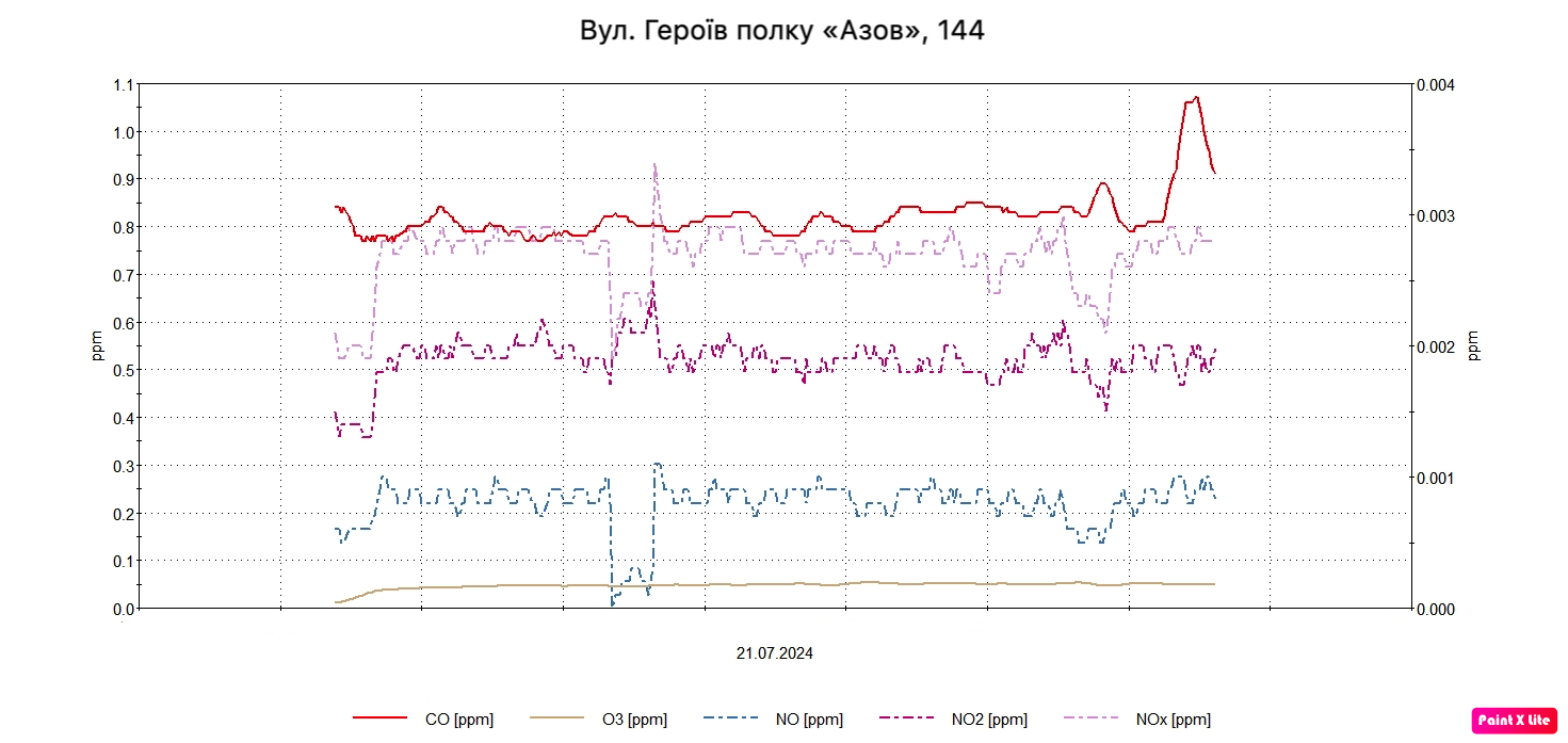 22 липня 2024Протягом 20 – 21.07.2024р. були проведені планові моніторингові дослідження атмосферного повітря на території житлової забудови по північному напрямку факелу викидів в точках по вул. Героїв полку «Азов», 144, Скульптурна, 72, з визначенням максимально-разових концентрацій оксиду вуглецю, азоту оксиду, азоту діоксиду, озону, пилу недиференційованого за складом, сірководню.