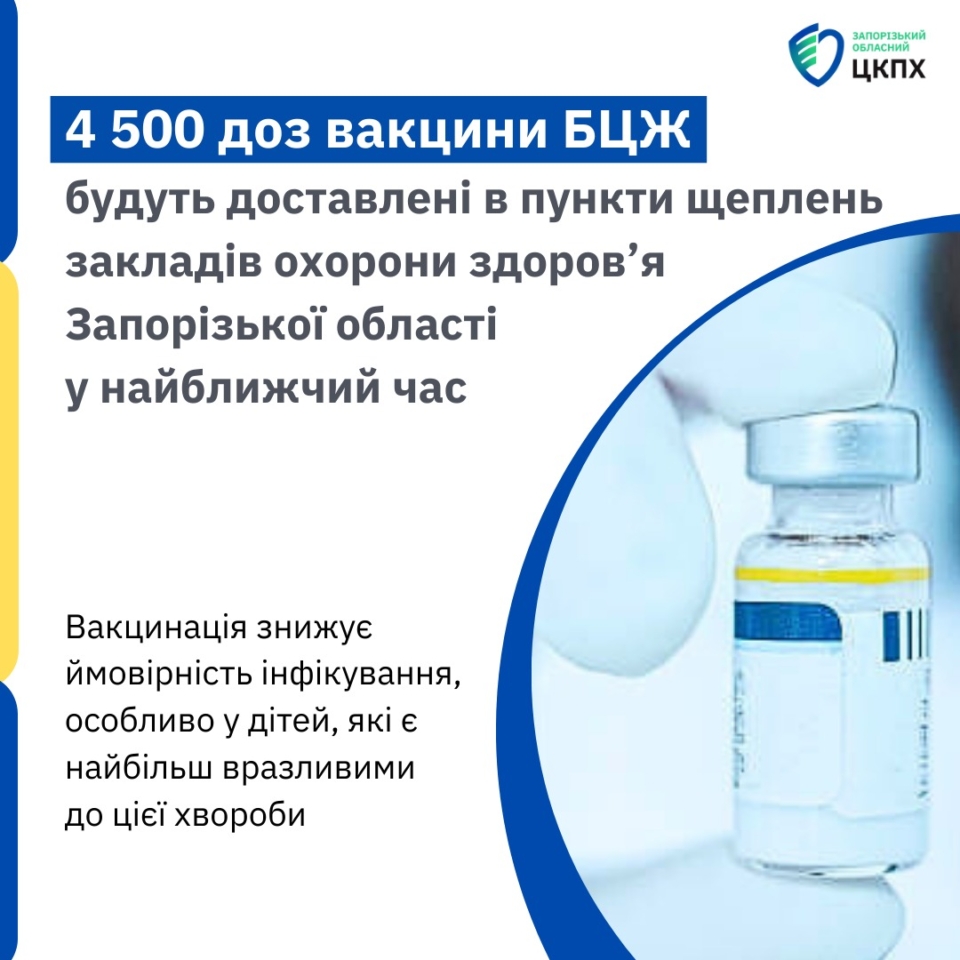 4 500 доз вакцини БЦЖ для безоплатних щеплень буде доставлено до пунктів вакцинації закладів охорони здоров’я Запорізької області вже найближчим часом — відповідно до затвердженого розподілу.