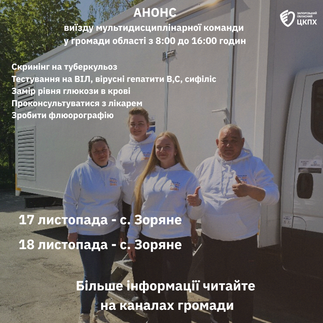 Анонс виїздів мобільної амболаторії: 17-18 листопада с. Зоряне
