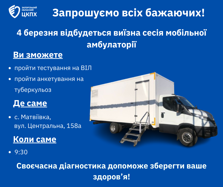 4 березня відбудеться виїзна сесія мобільної амбулаторії в Матвіївську сільську територіальну громаду, а саме в село Матвіївка.