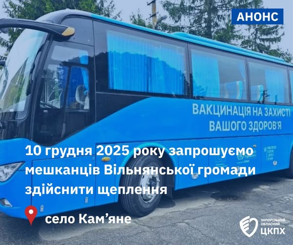 Запрошуємо мешканців Вільнянської громади 10 грудня 2025 року у село Кам’яне долучитися до виїзної вакцинальної сесії Запорізького обласного центру контролю та профілактики хвороб МОЗ України, яка відбудеться із залученням спеціалізованого транспорту.