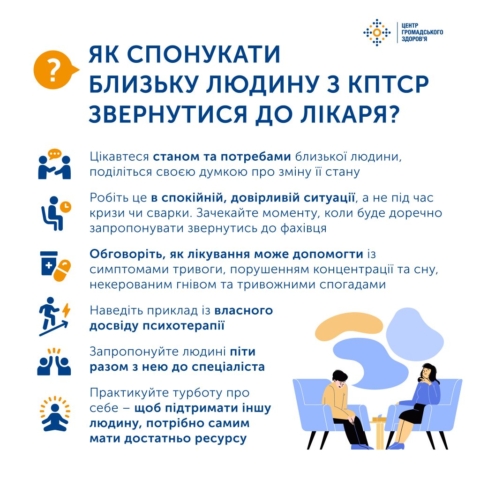 Водночас цікавтеся станом та потребами близької людини, поділіться своєю думкою про зміну її стану. Наприклад, скажіть, що помітили, що він/вона більше часу проводить на самоті, менше спить, не займається улюбленими справами. Робіть це в спокійній, довірливій ситуації, а не під час кризи чи сварки. Зачекайте моменту, коли буде доречно запропонувати звернутись до фахівця. Обговоріть, як лікування може допомогти із симптомами тривоги, порушенням концентрації та сну, некерованим гнівом та тривожними спогадами. Ви можете згадати про власний досвід психотерапії та розповісти, як він вам допоміг.