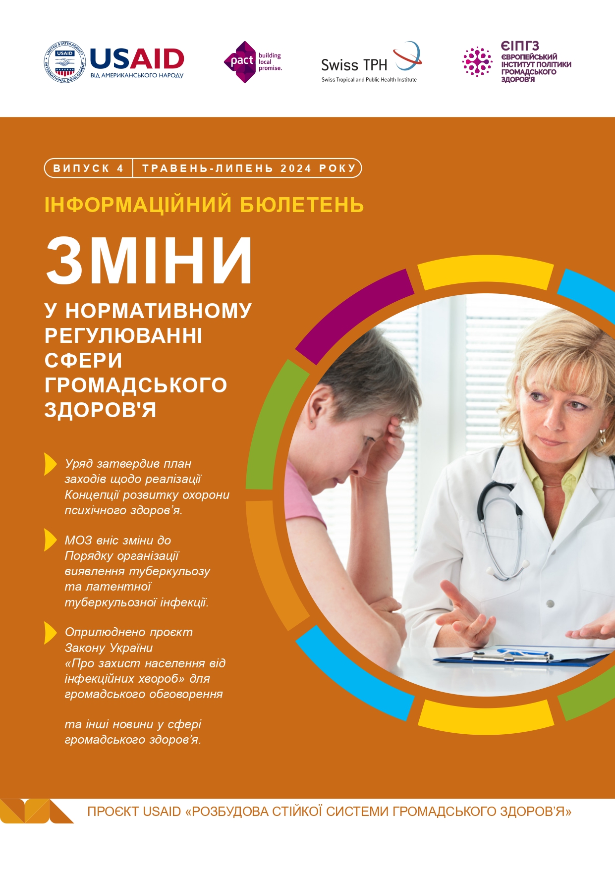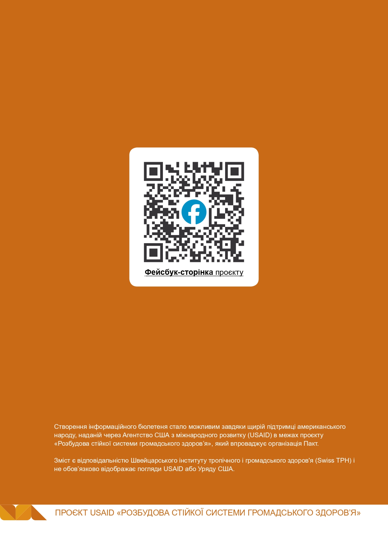 Проєкт «Розбудова стійкої системи громадського здоров’я» фінансується американським народом через Агентство США з міжнародного розвитку (USAID) і виконується організацією Пакт у партнерстві зі Швейцарським інститутом тропічної медицини та громадського здоров’я (Swiss TPH) та Європейським інсттутом політики громадського здоров’я (ЄІПГЗ).