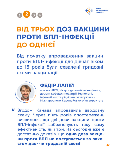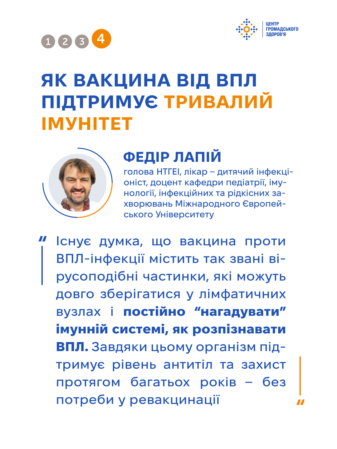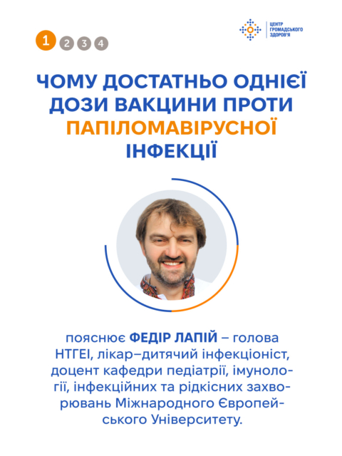 Чому ж одна доза може забезпечити такий самий рівень ефективності, як дві чи навіть три? Про секрет стійкого імунітету після вакцинації проти ВПЛ розповідає Федір Лапій, голова Національної технічної групи експертів з питань імунопрофілактики, лікар – дитячий інфекціоніст, доцент кафедри педіатрії, імунології, інфекційних та рідкісних захворювань Міжнародного Європейського Університету.