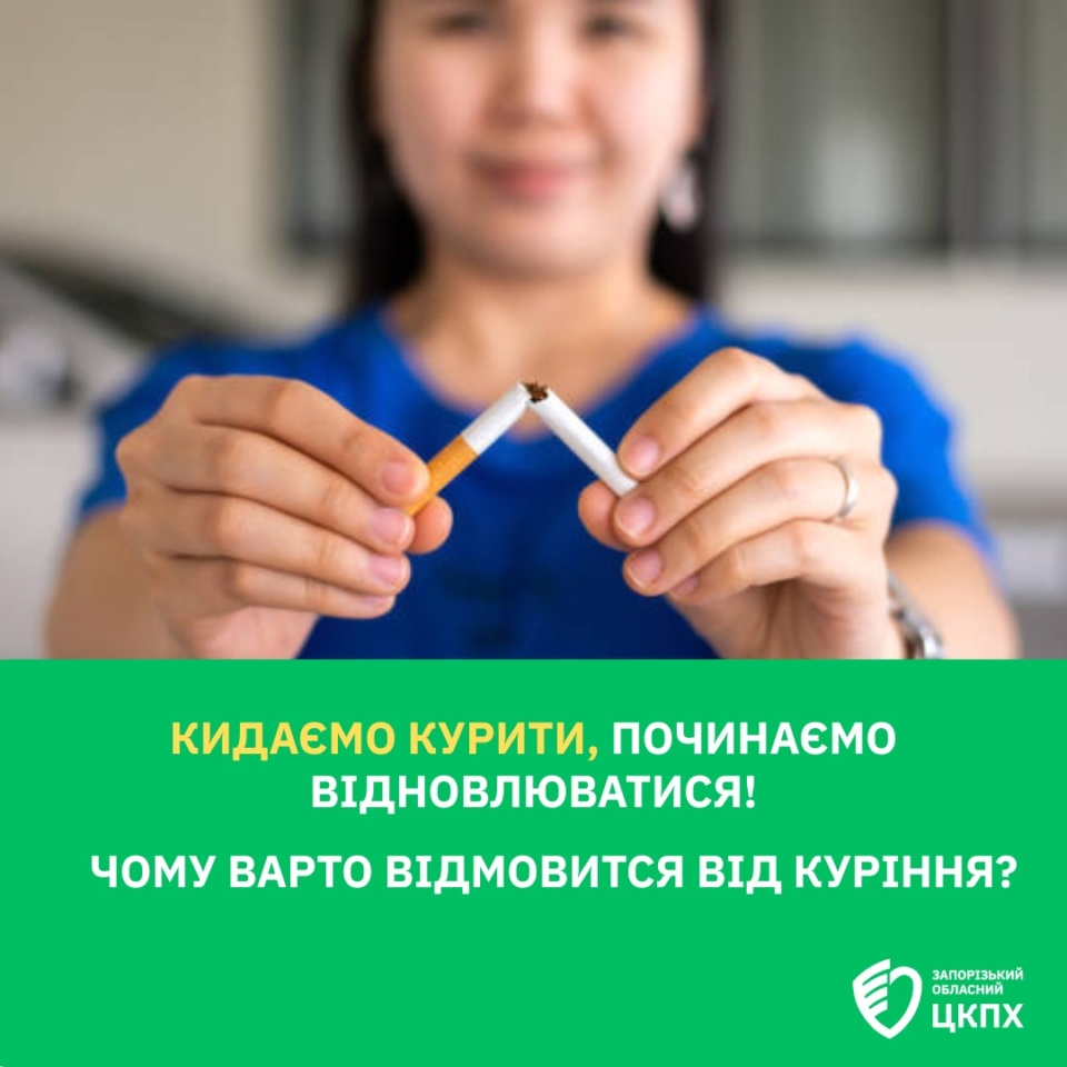 Вже з першого дня відмови від сигарет ваш організм почне відновлюватися, а ризики виникнення хвороб, асоційованих з курінням, зменшуватися. Отже, кидаємо курити та починаємо відновлюватись!