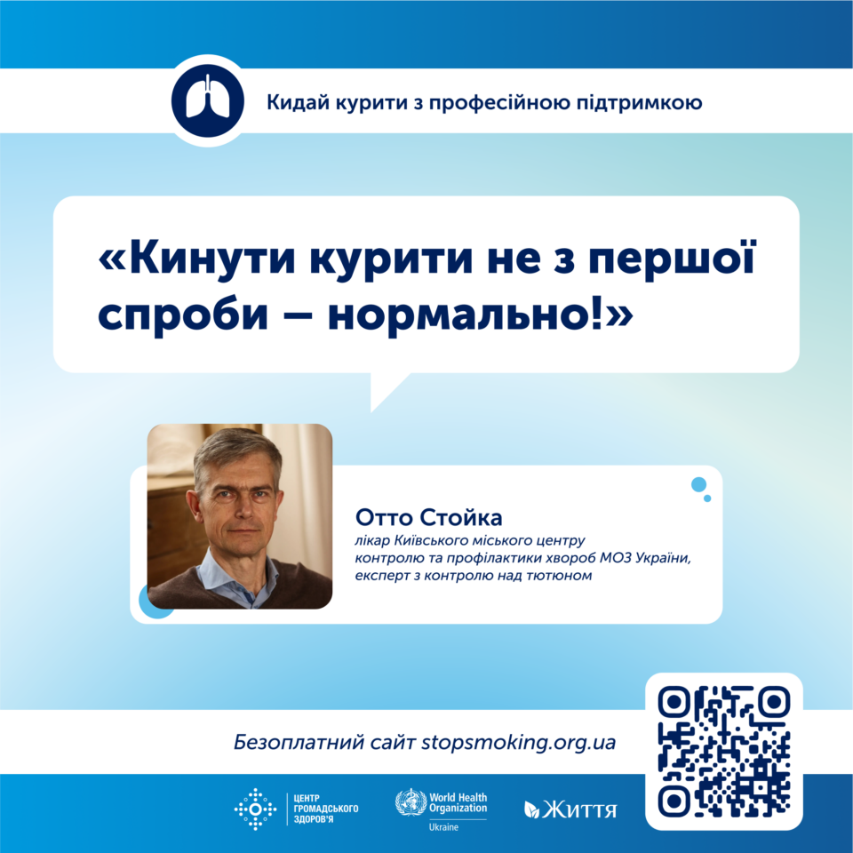 “Звернутися за професійною допомогою — це завжди правильне рішення! Фахівець допоможе знайти ефективні стратегії відмови від куріння та дасть поради, що спрацюють саме у твоєму випадку. До того ж перебування під наглядом лікаря мотивуватиме не зриватися — і ти обов’язково досягнеш успіху”, — наголошує Отто Стойка, лікар Київського міського центру контролю та профілактики хвороб МОЗ України, експерт з контролю над тютюном.