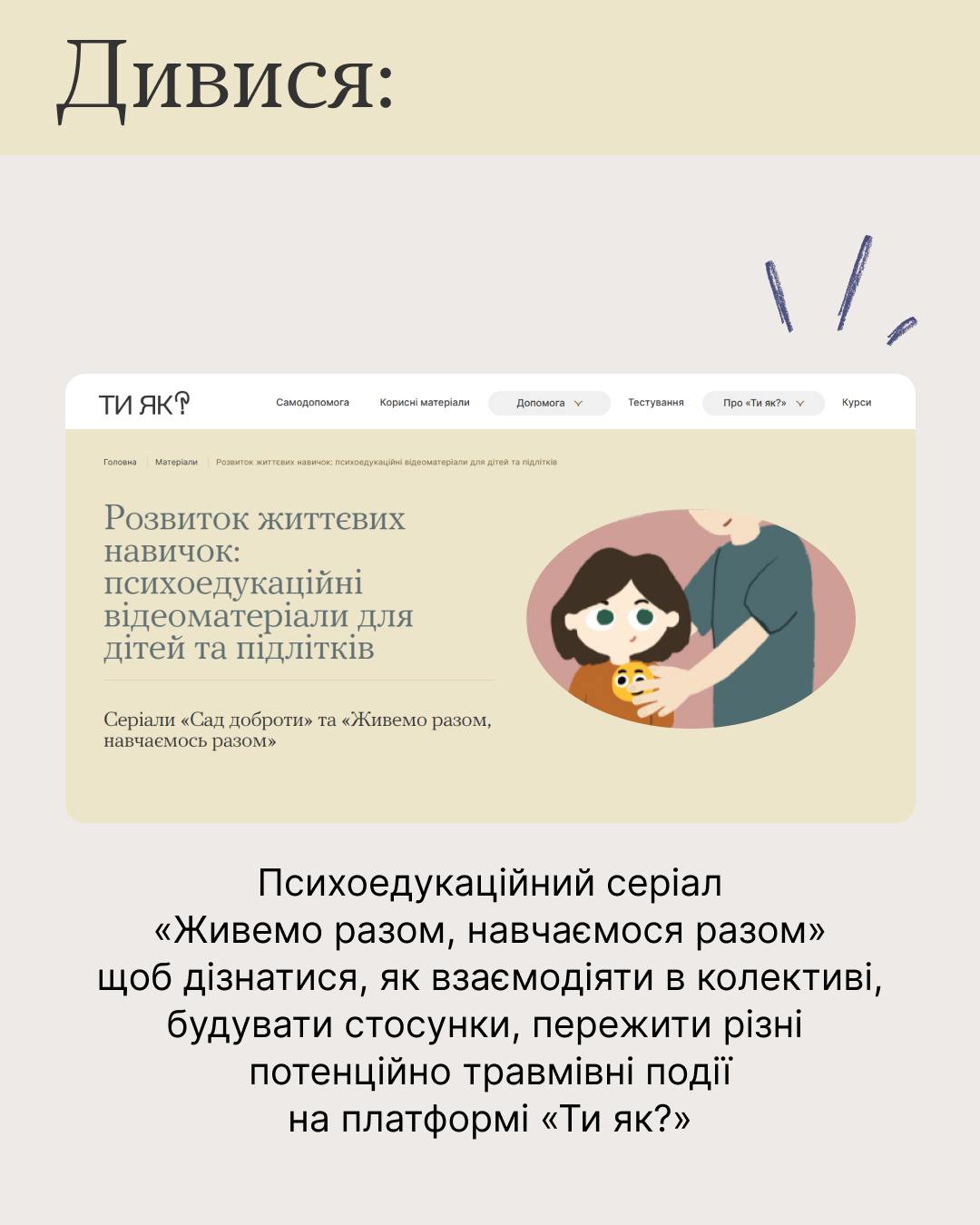 У каруселі зібрані матеріали з платформи «Ти як?», що допоможуть підліткам потурбуватися про себе. І дорослим — піклуватися про близьких, майже дорослих дітей.