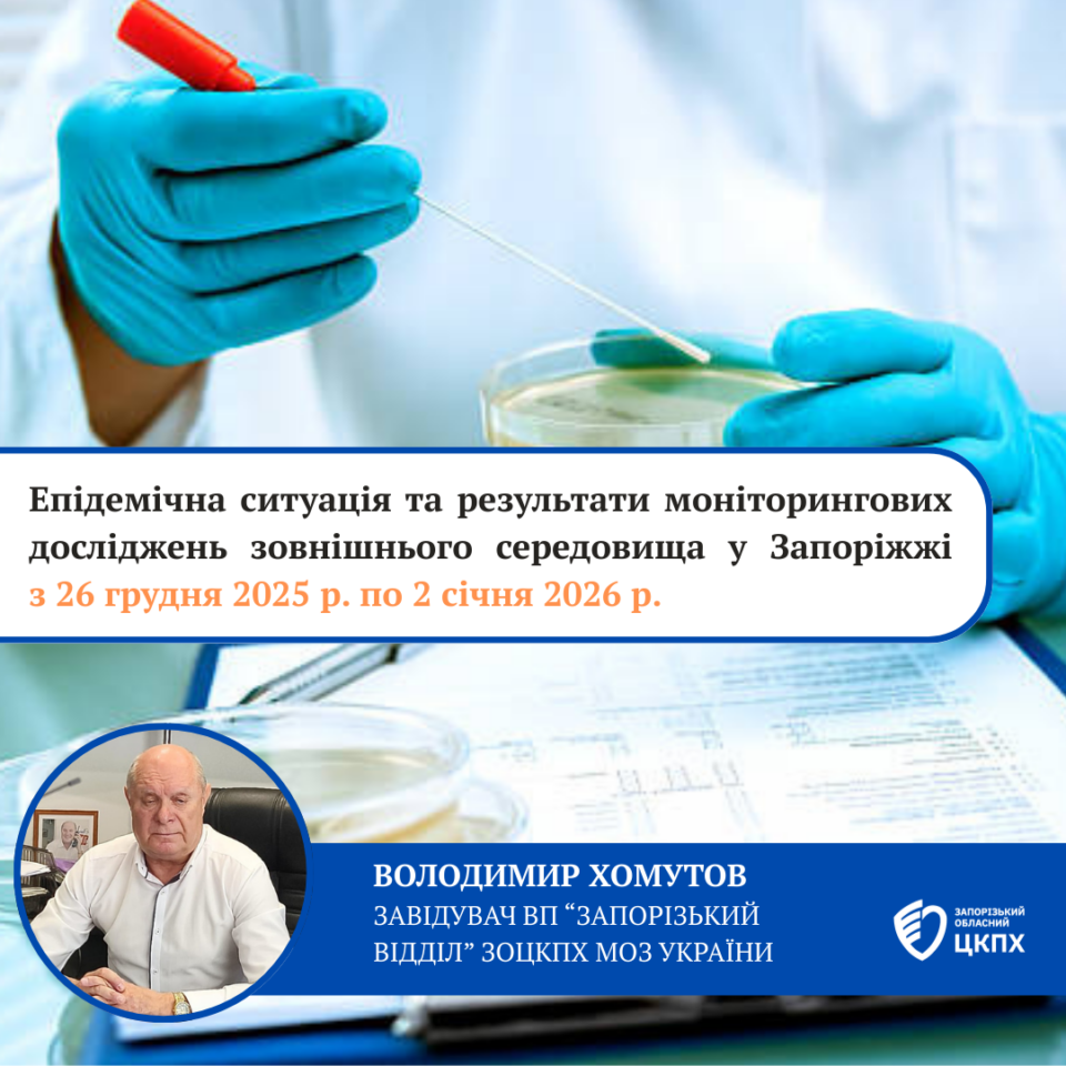 Фахівці відокремленого підрозділу «Запорізький відділ» на попередньому тижні, з 26 грудня 2025 р. по 2 січня 2026 р., продовжували аналіз епідситуації та проведення моніторингових досліджень зовнішнього середовища в м. Запоріжжя.