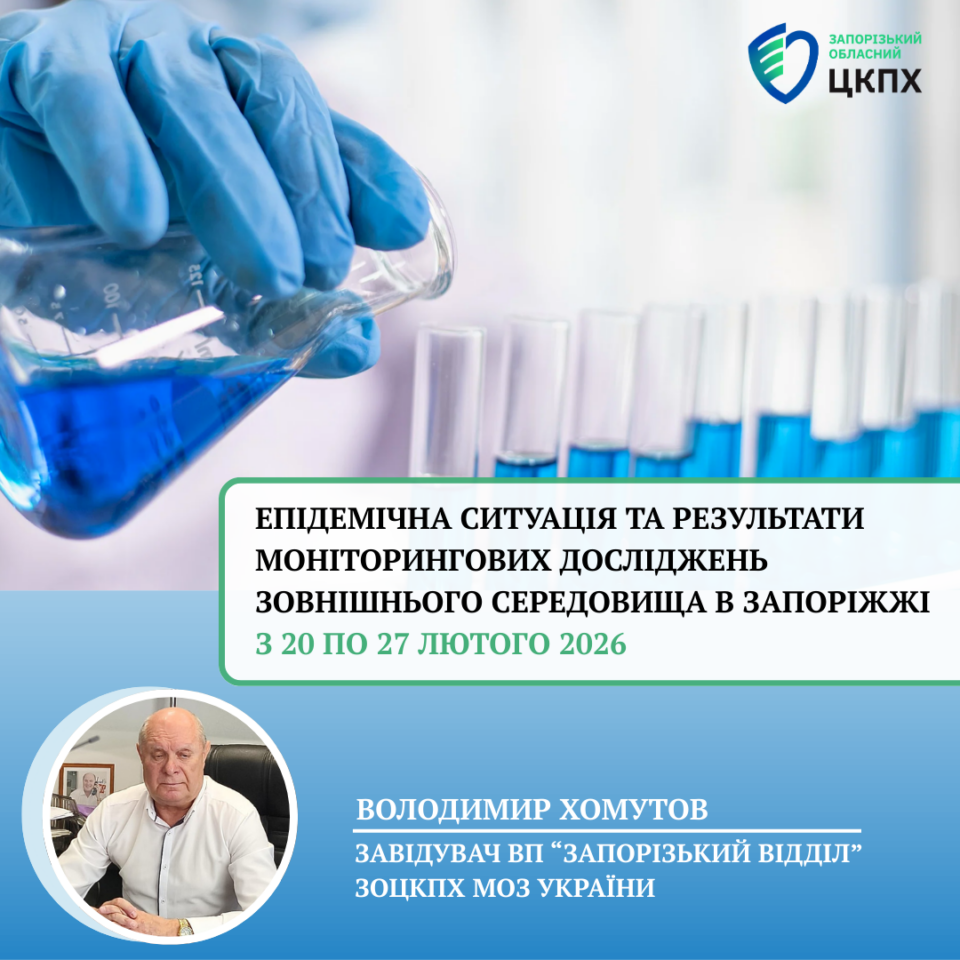 З 20 по 27 лютого 2026 року фахівці відокремленого підрозділу «Запорізький відділ» продовжували аналіз епідситуації та проведення моніторингових досліджень зовнішнього середовища в м. Запоріжжя.