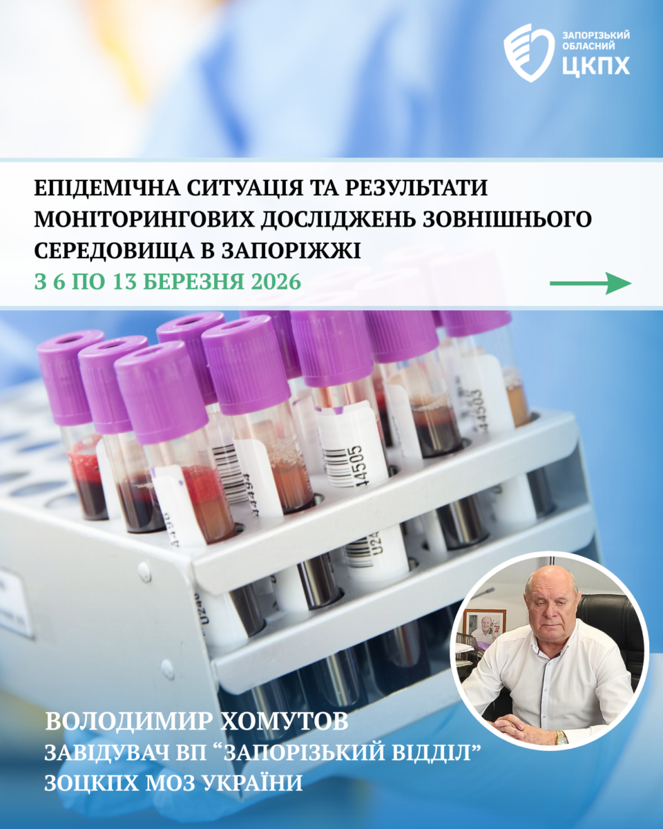 На попередньому тижні, з 6 по 13 березня 2026р., фахівці відокремленого підрозділу «Запорізький відділ» Запорізького ОЦКПХ продовжували аналіз епідситуації та проведення моніторингових досліджень зовнішнього середовища в м. Запоріжжі.