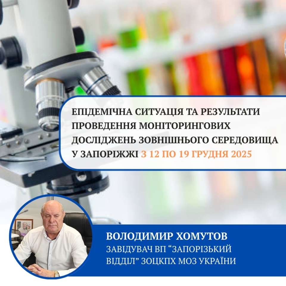 Про епідемічну ситуацію та результати моніторингових досліджень зовнішнього середовища у Запоріжжі за тиждень (з 12 по 19 грудня 2025 року)