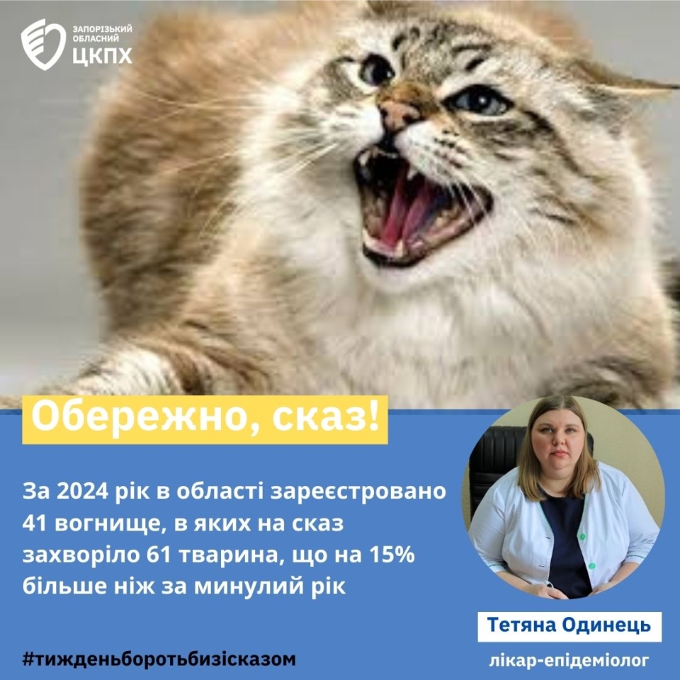 Епізоотична ситуація зі сказу в Запорізькій області залишається неблагополучною. Природні вогнища існують практично на всій території. Щорічно реєструється значна кількість захворювань на сказ серед тварин. За 2024 рік в області зареєстровано 41 вогнище, в яких на сказ захворіло 61 тварина, що на 15% більше ніж за минулий рік. Кількість людей, які звернулися за антирабічною допомогою також збільшилась майже на 10% і скадає 1948 осіб, в.т.ч.- 393 діти.