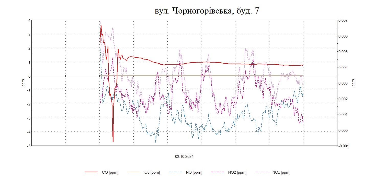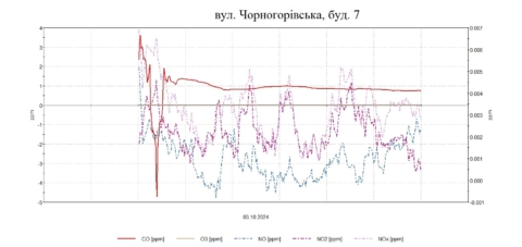 Протягом дня були проведені планові моніторингові дослідження атмосферного повітря на території житлової забудови по південному напрямку факелу викидів в точці по вул. Чорногорівська, 7 з визначенням максимально-разових концентрацій оксиду вуглецю, сірководню, ангідриду сірчистого, формальдегіду, аміаку, азоту оксиду, азоту діоксиду, озону, фенолу, пилу недиференційованого за складом, хлору.