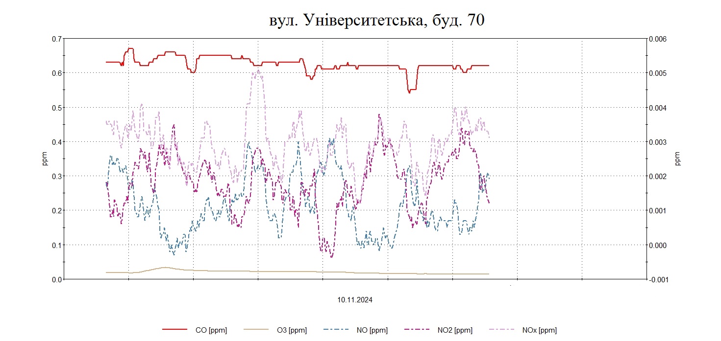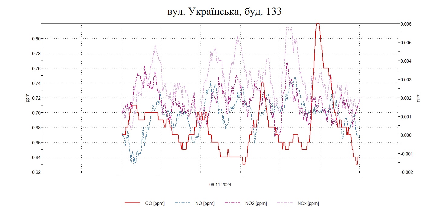 Протягом дня були проведені планові моніторингові дослідження атмосферного повітря на території житлової забудови по північно-східному, північному напрямку факелу викидів в точках по вул. Українська, 133, Північне шосе, 10, Героїв полку «Азов», 144, Університетська, 70 з визначенням максимально-разових концентрацій оксиду вуглецю, азоту оксиду, азоту діоксиду , озону, пилу недиференційованого за складом, сірководню .