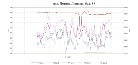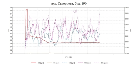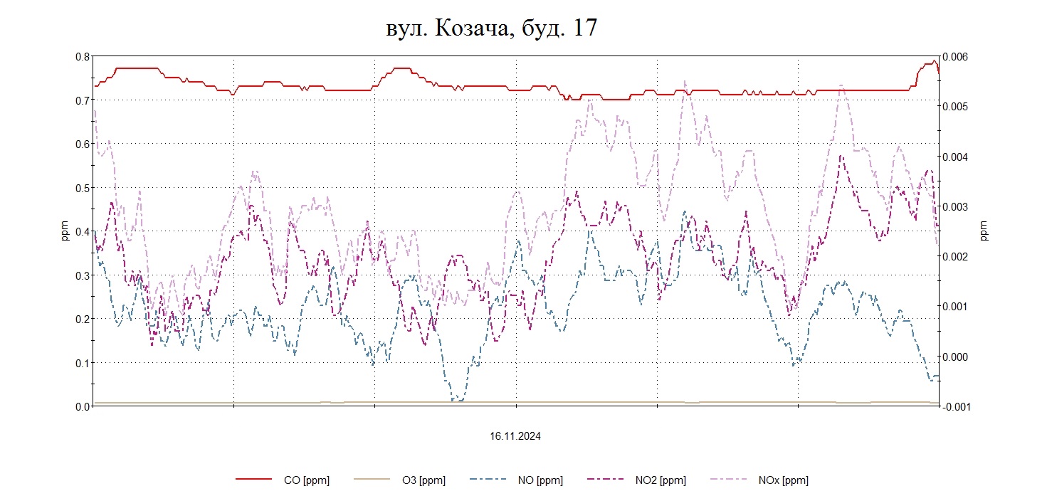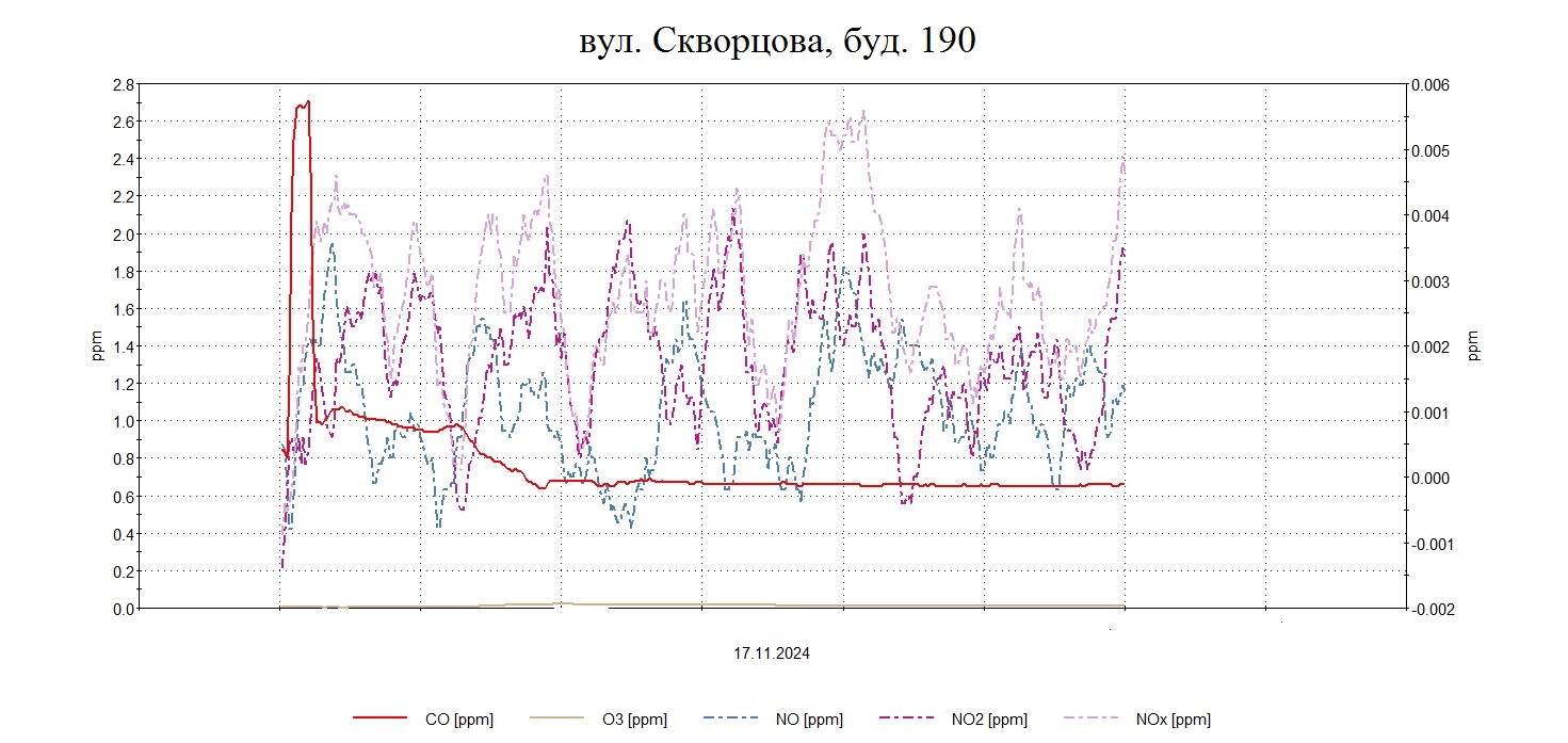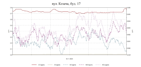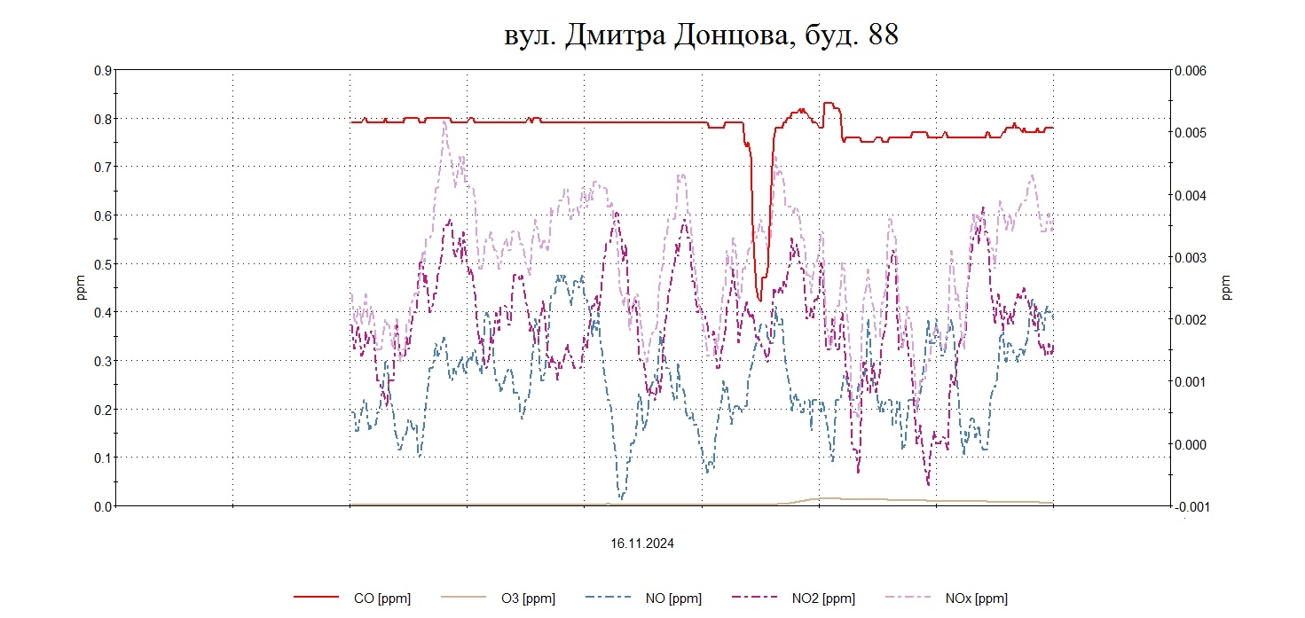 Протягом дня були проведені планові моніторингові дослідження атмосферного повітря на території житлової забудови по північно-західному, південному напрямку факелу викидів в точках по вул. Козача,17, Д.Донцова,2, Скворцова,190, Військбуд,89 з визначенням максимально-разових концентрацій оксиду вуглецю, азоту оксиду, азоту діоксиду , озону, пилу недиференційованого за складом, сірководню .