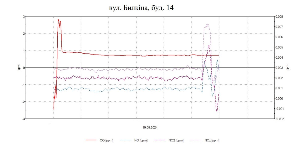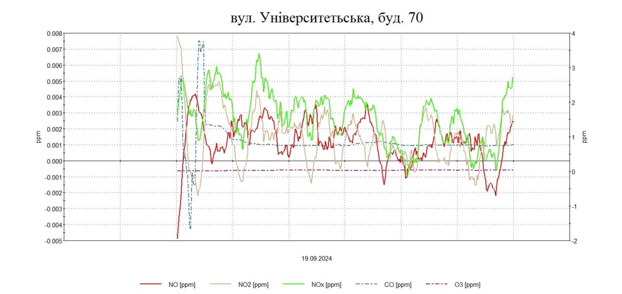 Протягом дня були проведені планові моніторингові дослідження атмосферного повітря на території житлової забудови по північно-східному напрямку факелу викидів в точках по вул. Билкіна,14, вул. Університетська,70 з визначенням максимально-разових концентрацій оксиду вуглецю, сірководню, ангідриду сірчистого, формальдегіду, аміаку, азоту оксиду, азоту діоксиду, озону, фенолу, бензолу, толуолу, ксилолу, пилу недиференційованого за складом, хлору, водню фтористого, марганцю, ацетону.