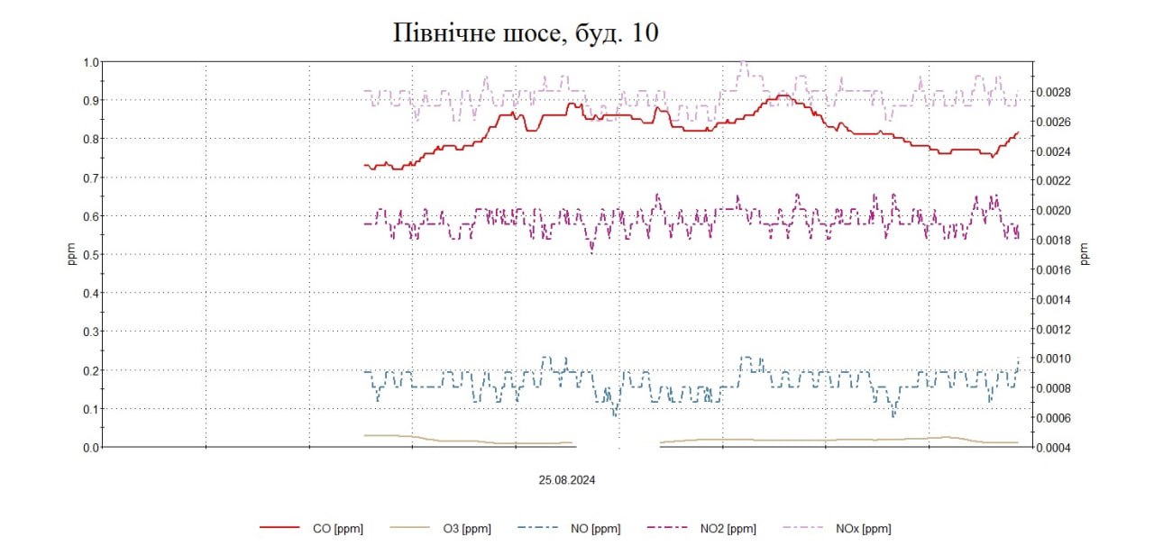 Протягом дня були проведені планові моніторингові дослідження атмосферного повітря на території житлової забудови по північному, східному напрямку факелу викидів в точках по вул. Зоряна, 4, вул. Водограйна, 3, Північне шосе, 10, вул. Незалежної України, 14 з визначенням максимально-разових концентрацій оксиду вуглецю, азоту оксиду, азоту діоксиду , озону, пилу недиференційованого за складом, сірководню.