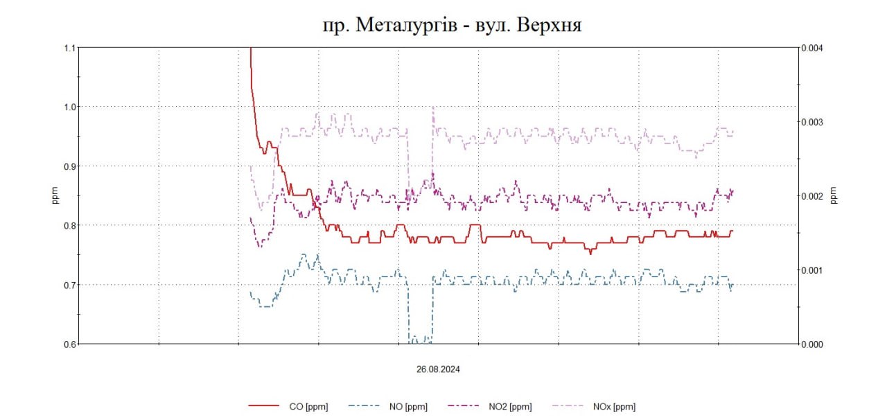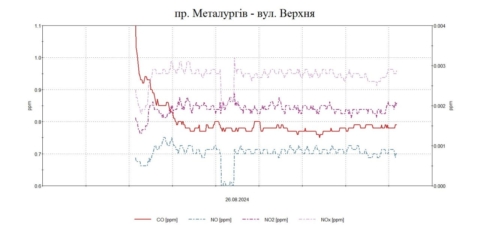 27 серпня 2024Протягом дня були проведені планові моніторингові дослідження атмосферного повітря на території житлової забудови по північно-східному напрямку факелу викидів в точках по пр. Металургів-Верхня, вул. Гоголя,163 з визначенням максимально-разових концентрацій оксиду вуглецю, сірководню, ангідриду сірчистого, формальдегіду, аміаку, азоту оксиду, азоту діоксиду, озону, фенолу, бензолу, толуолу, ксилолу, пилу недиференційованого за складом, хлору, водню фтористого, марганцю, ацетону.