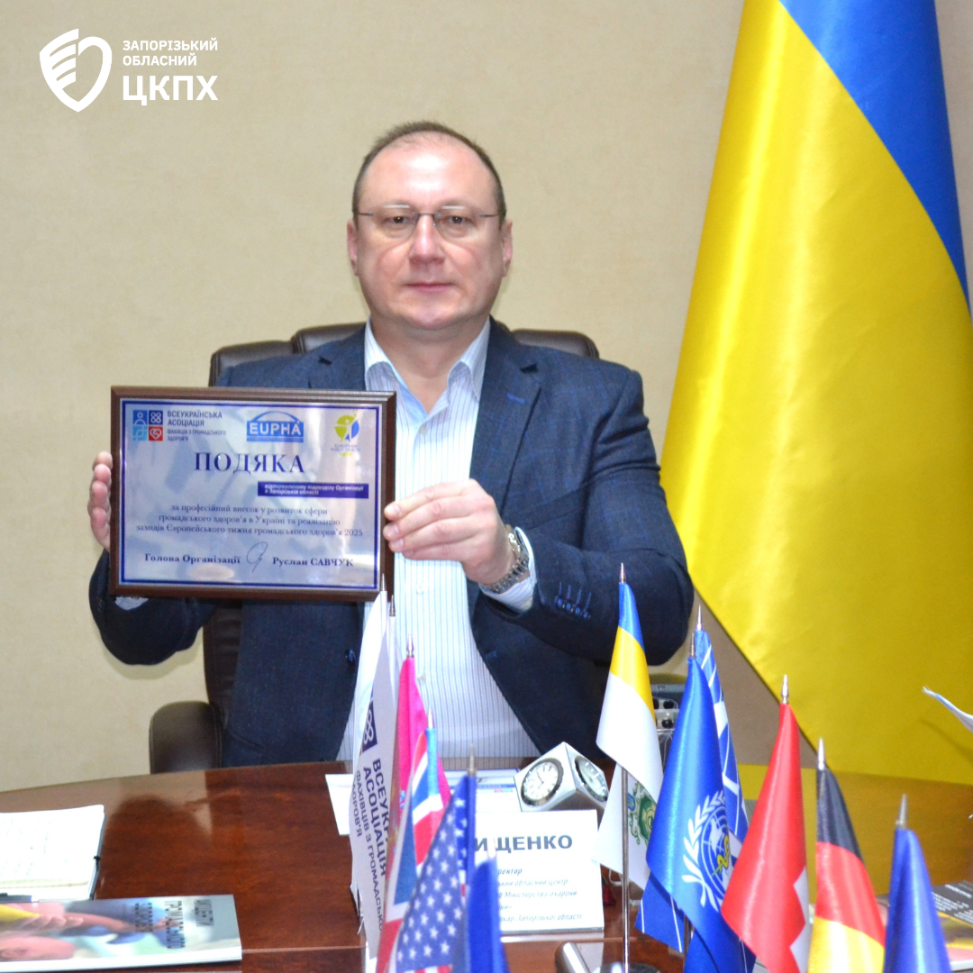 Колектив Запорізького осередку, відокремлений підрозділ Всеукраїнської асоціації фахівців з громадського здоров’я, на чолі з керівником, генеральним директором Запорізького ОЦКПХ Тарасом Тищенком відмічено Подякою за професійний внесок у розвиток сфери громадського здоров’я в Україні та реалізацію заходів Європейського тижня громадського здоров’я 2025.