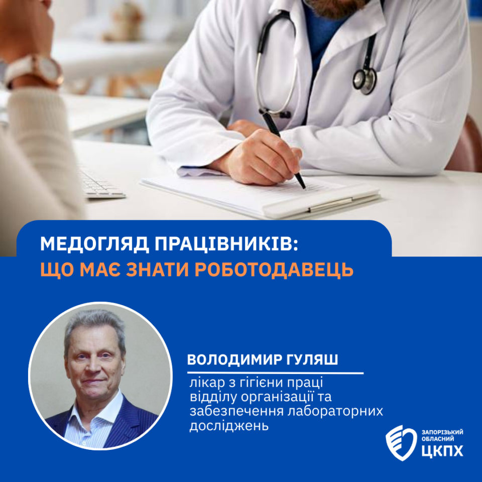ДУ «ЗАПОРІЗЬКИЙ ОЦКПХ МОЗ» нагадує, що працівники, зайняті на важких роботах, роботах зі шкідливими або небезпечними умовами праці, чи такі де є потреба у професійному доборі, мають проходити попередні ( під час прийняття на роботу ) і періодичні (протягом трудової діяльності) медогляди (ст.169 КЗпП; ст.17 Закону України «Про охорону праці» від 14.10.1992 № 2694-Х11 ).
