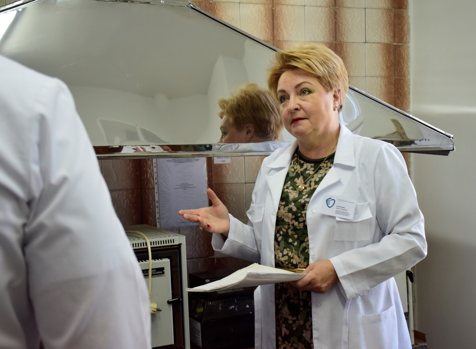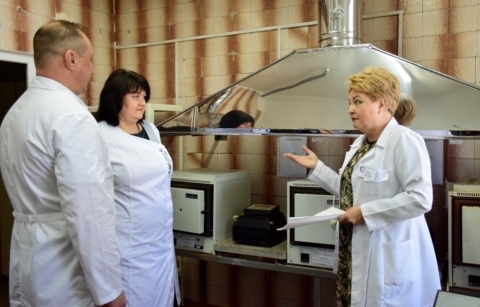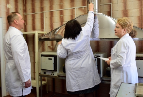 Завідувач санітарно-гігієнічної лабораторії Наталія Авдєєва продемонструвала керівництву переваги процесу пробопідготовки харчових продуктів з підключенням оновленої витяжної системи.