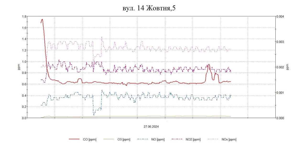Протягом дня були проведені планові моніторингові дослідження атмосферного повітря на території житлової забудови по північно-західному напрямку факелу викидів в точках по вул. 14 Жовтня, 5, Героїв полку «Азов», 144 з визначенням максимально-разових концентрацій оксиду вуглецю, сірководню, ангідриду сірчистого, формальдегіду, аміаку, азоту оксиду, азоту діоксиду, озону, фенолу, пилу недиференційованого за складом, хлору.