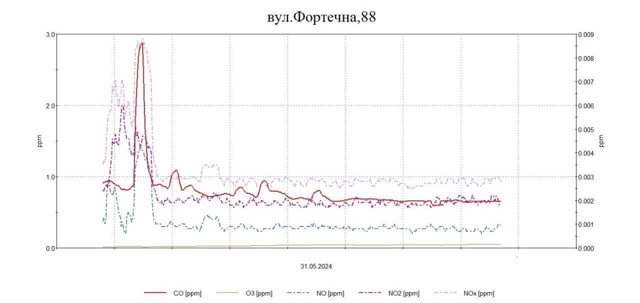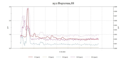 Протягом дня були проведені планові моніторингові дослідження атмосферного повітря на території житлової забудови по західному напрямку факелу викидів в точці по вул. Фортечна, 88 з визначенням максимально-разових концентрацій оксиду вуглецю, сірководню, ангідриду сірчистого, формальдегіду, аміаку, азоту оксиду, азоту діоксиду , озону, фенолу, зважених речовин, хлору.