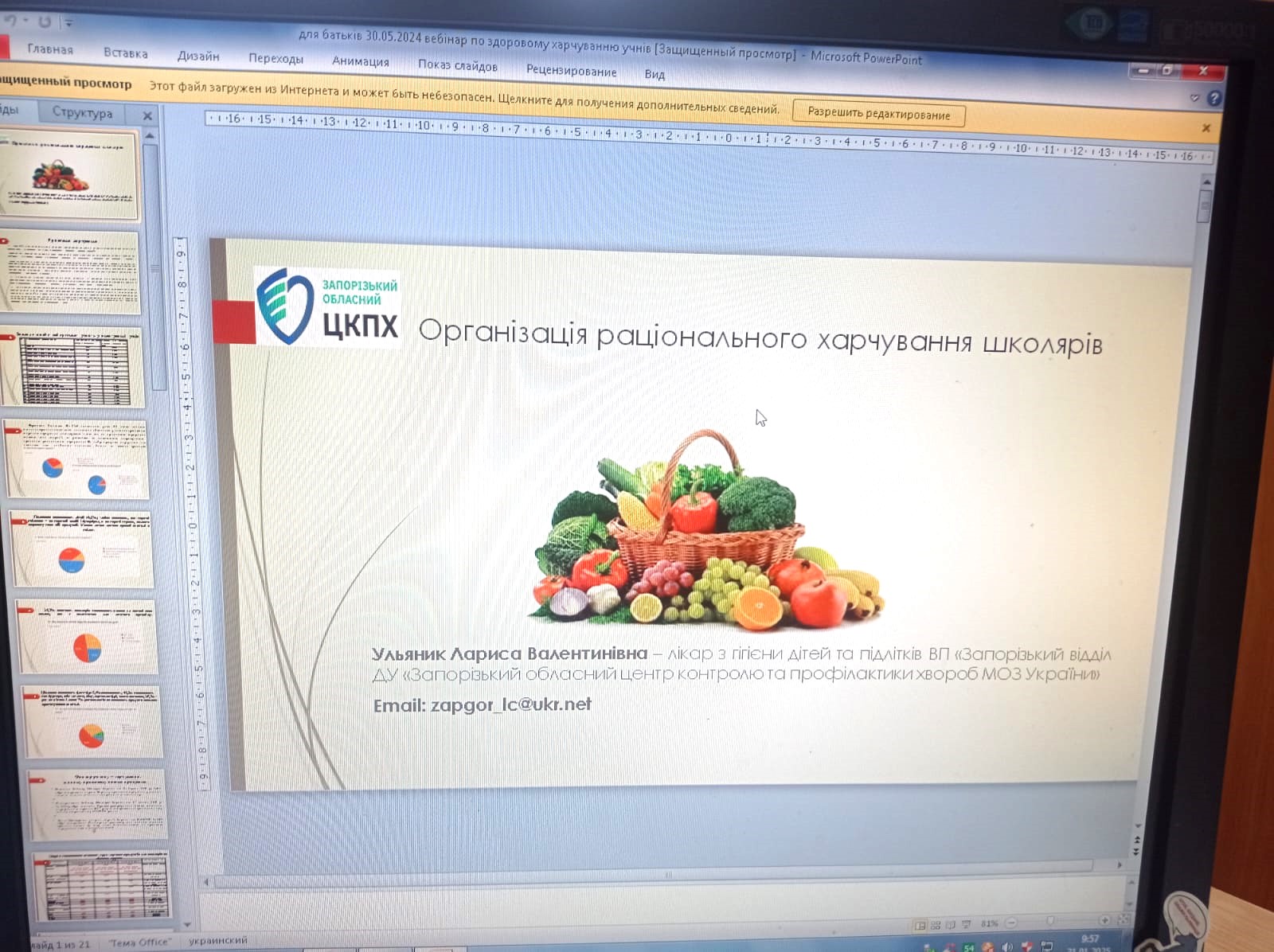 Днями лікарка з гігієни дітей та підлітків відокремленого підрозділу «Запорізький відділ» Лариса Ульяник провела вебінар для учнів 8-х класів Запорізької гімназії № 47. Тема онлайн зустрічі «Навички раціонального харчування, що сприяють здоров’ю».