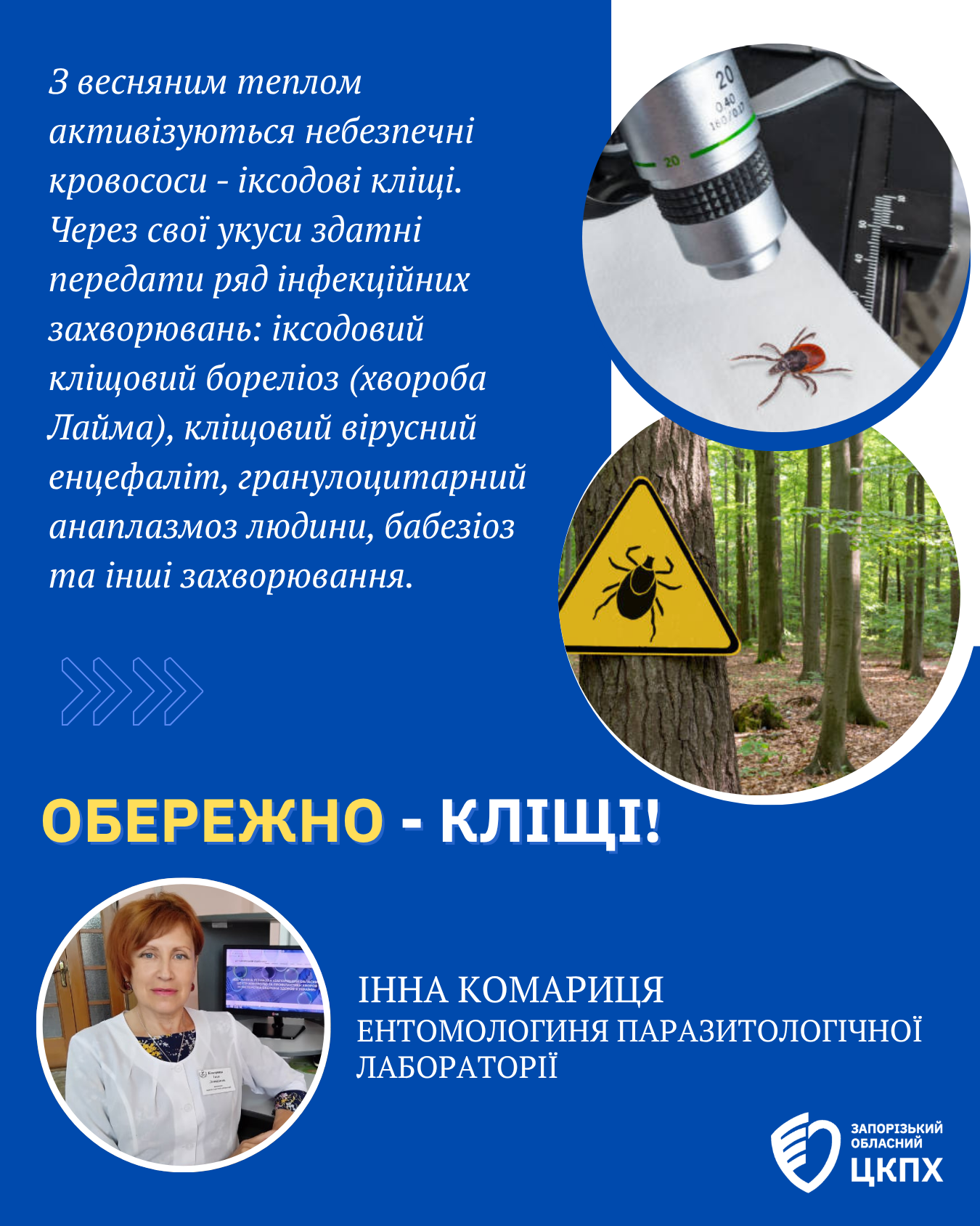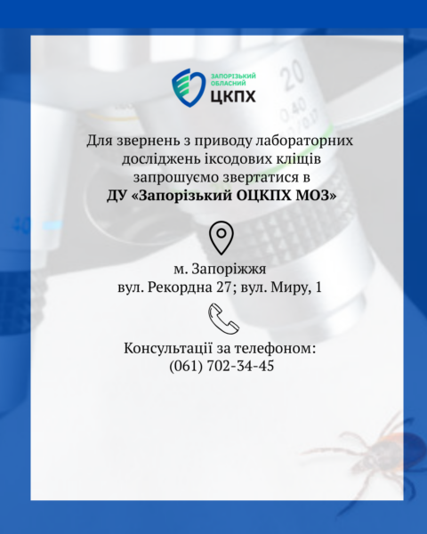 З приводу лабораторних досліджень іксодових кліщів звертайтеся в Запорізький ОЦКПХ за адресами: м. Запоріжжя, вул. Рекордна 27; вул. Миру, 1. Телефон для консультацій: (061) 702-34-45, e-mail: [email protected]