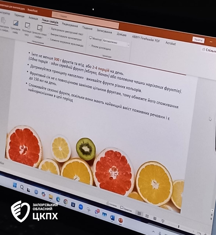 28 листопада 202527 листопада у Запорізькому академічному ліцеї № 23 Ганна Турчаненко, лікарка відокремленого підрозділу «Запорізький відділ», в межах проєкту «П’ять кроків до здорового харчування» здійснила онлайн захід з презентацією «Основи здорового харчування. Чому важливо говорити з дітьми на цю тему».
