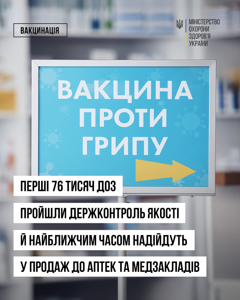 Перші 76 тисяч доз вакцини проти грипу пройшли держконтроль якості й найближчим часом надійдуть у продаж до аптек та медзакладів – МОЗ