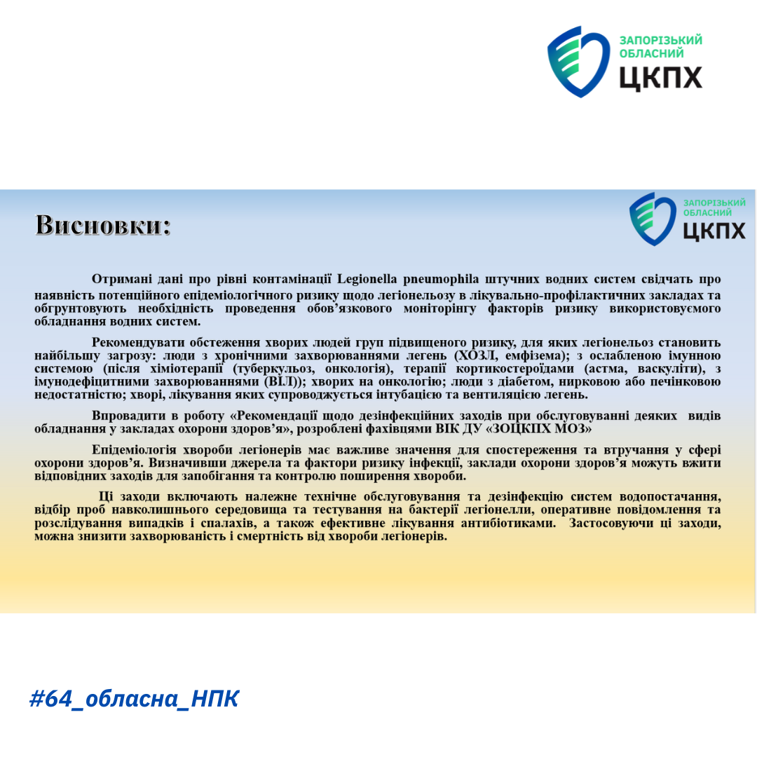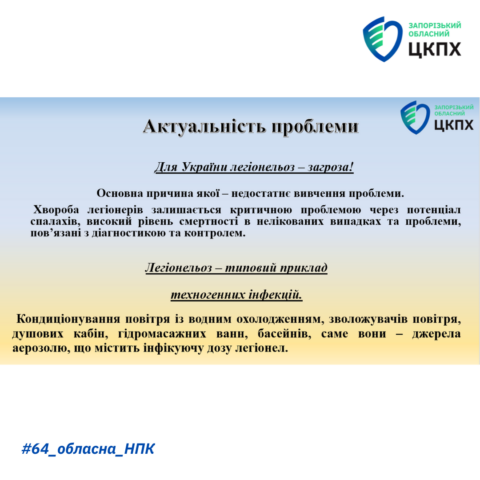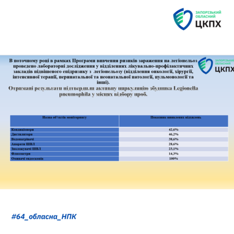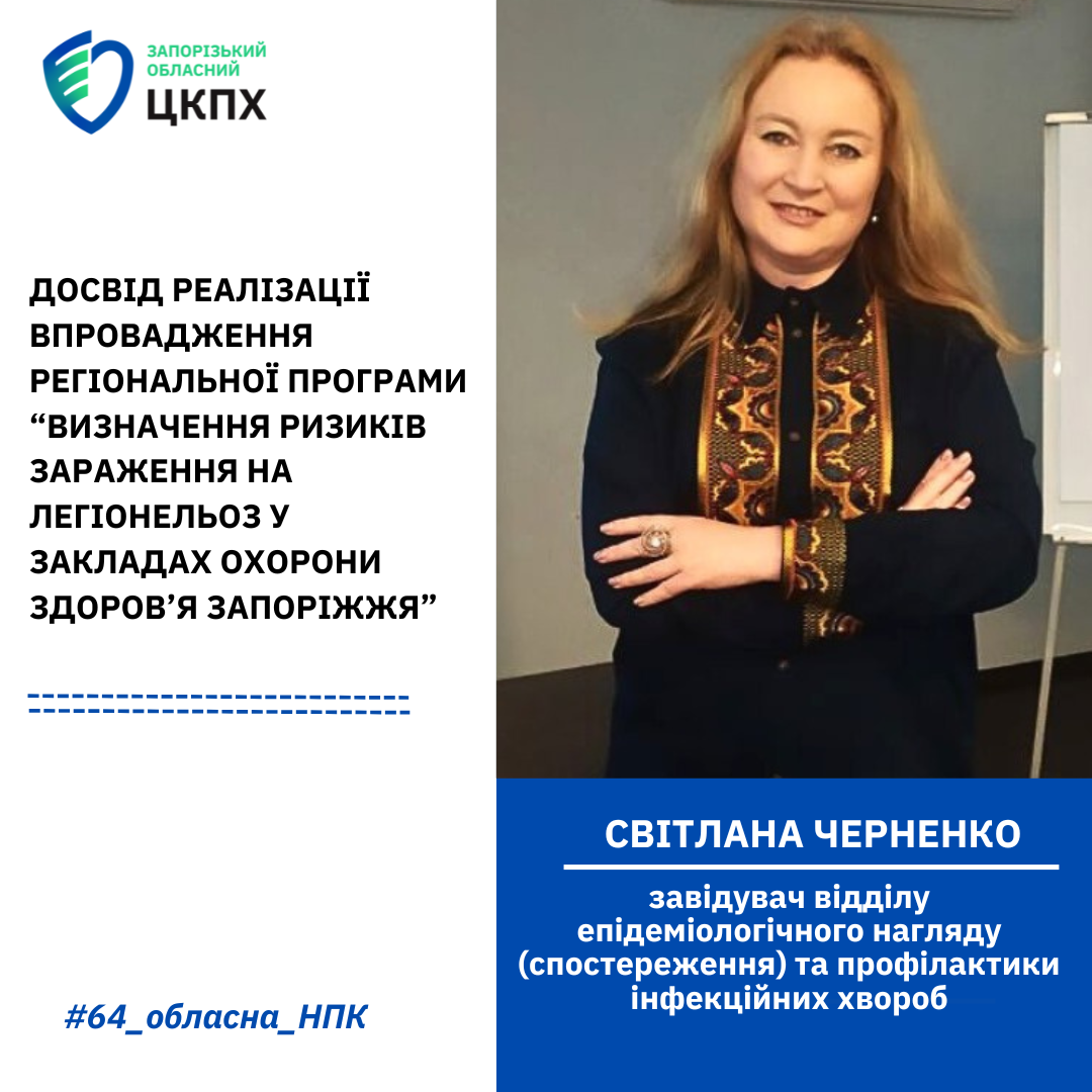 Доповідь: «Досвід реалізації впровадження регіональної програми: Визначення ризиків зараження на легіонельоз у закладах охорони здоров’я міста Запоріжжя»