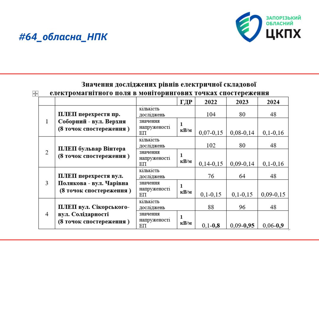 - За результатами проведених досліджень встановлено, що протягом трьох воєнних років спостережень на всіх моніторингових точках перевищення ГДР електричного поля не зареєстровано.