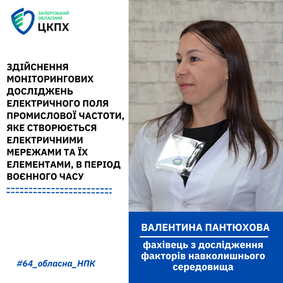 Ще одна робота колективу фахівців лабораторії електромагнітних полів та інших фізичних факторів привертає особливу увагу своєю актуальністю. Розпочата у другому півріччі 2022 року, коли обстріли Запорізької області стали частіше, коли Запорізька АЕС опинилася на окупованій території та почалися перебої з електропостачанням у зв’язку з підривом опор електромереж. Доповідь-презентацію представила фахівець з дослідження факторів навколишнього середовища Валентина Пантюхова.