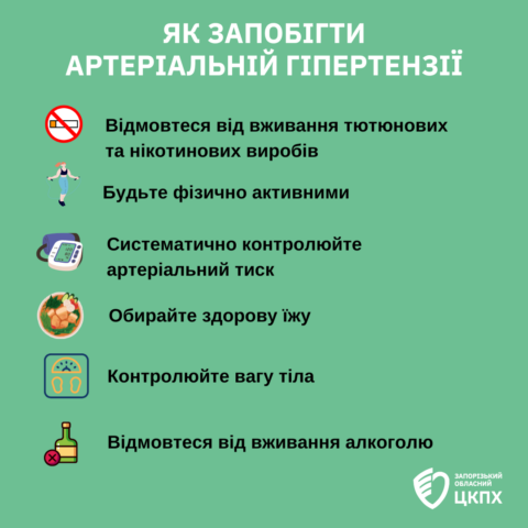 У Всесвітній день боротьби з артеріальною гіпертензією фахівці Запорізького ОЦКПХ нагадують про основні поради, що допоможуть запобігти небезпечному захворюванню: