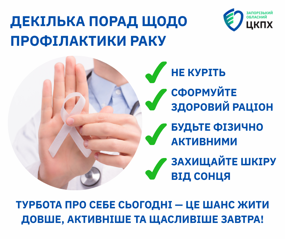 Рак не обирає за віком чи статтю — він вражає як літніх людей, так і молодь, включно з дітьми, незалежно від соціального статусу чи рівня доходу. Але чимало з онкологічних захворювань можна попередити, якщо вчасно змінити звички та уважно ставитися до власного здоров’я. Нагадуємо основні рекомендації, які допоможуть знизити ризик розвитку раку: