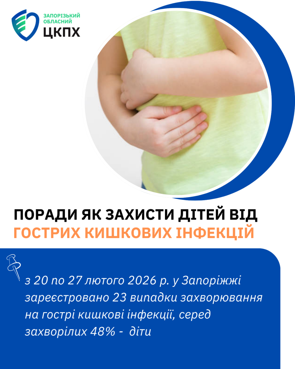 Щодо епідемічної ситуації з гострих кишкових інфекцій у м. Запоріжжя: з 20 по 27 лютого 2026 року зареєстровано 23 випадки ГКІ, серед захворілих 48% дітей.